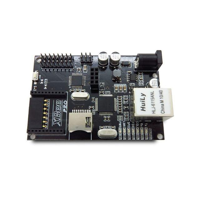 Iboard is a unique Arduino board which features a WIZnet ethernet port, an XBee socket, nRF24L01+ module interface and an ATMega328. This board will add wireless XBee / nRF24L01+ control as well as internet connectivity to your projects. It`s great for anything from home automation to robot control. The possibilities are endless.