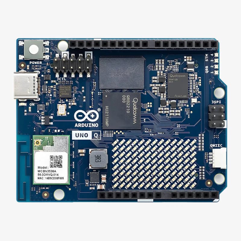 The Official Arduino UNO Q 2GB Single Board Computer ABX00162 is a powerful hybrid development platform that combines a quad-core Arm Cortex-A53 processor with an integrated STM32U585 microcontroller, delivering Linux computing performance alongside real-time control capabilities. Designed for AI, IoT, robotics, and advanced embedded system applications, it offers seamless dual-environment development for both high-level and low-level programming. With advanced Adreno graphics, onboard eMMC storage, wireless connectivity, and integrated AI support, the UNO Q 2GB enables developers to run Linux applications, Arduino sketches, and Python scripts simultaneously, making it ideal for intelligent edge devices and smart automation systems.